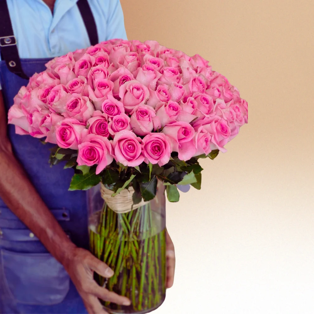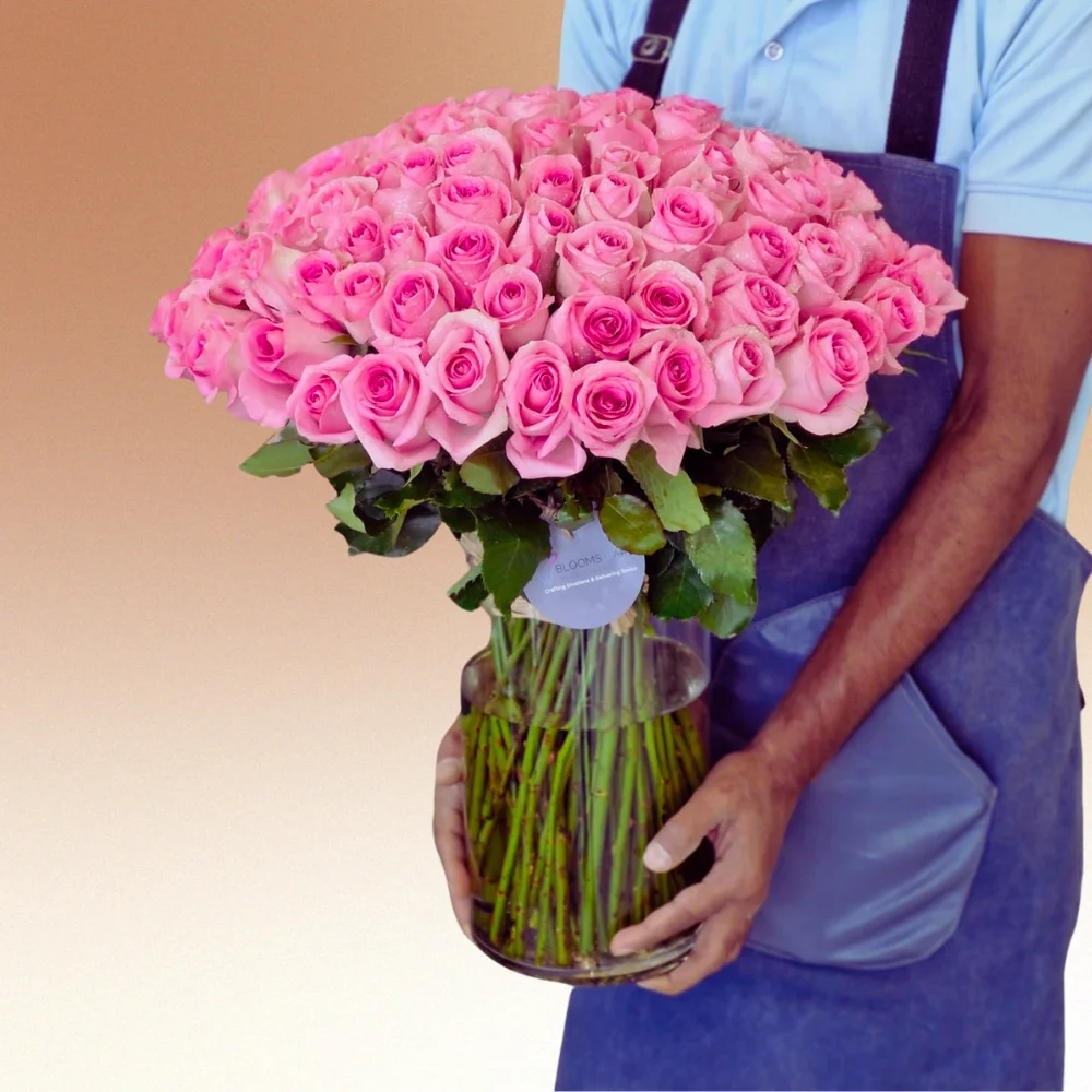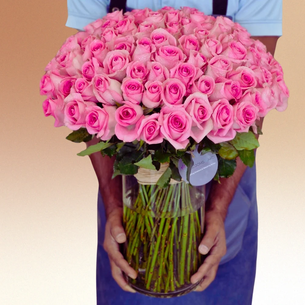 Capture the enchanting beauty of 100 pink blooms with our exclusive ‘Fireworks’ design—an extraordinary floral gift that is sure to dazzle and delight the special women in your life, whether it’s your wife, sister, mother, or close friend. This breathtaking arrangement features a generous selection of vibrant pink roses, expertly arranged by our skilled florists in a stunning 30 cm-tall cylinder glass vase. Every detail, from the beautifully rounded shape to the freshness of each pink bloom, reflects the utmost care and dedication, making it a spectacular masterpiece that radiates beauty from top to bottom.