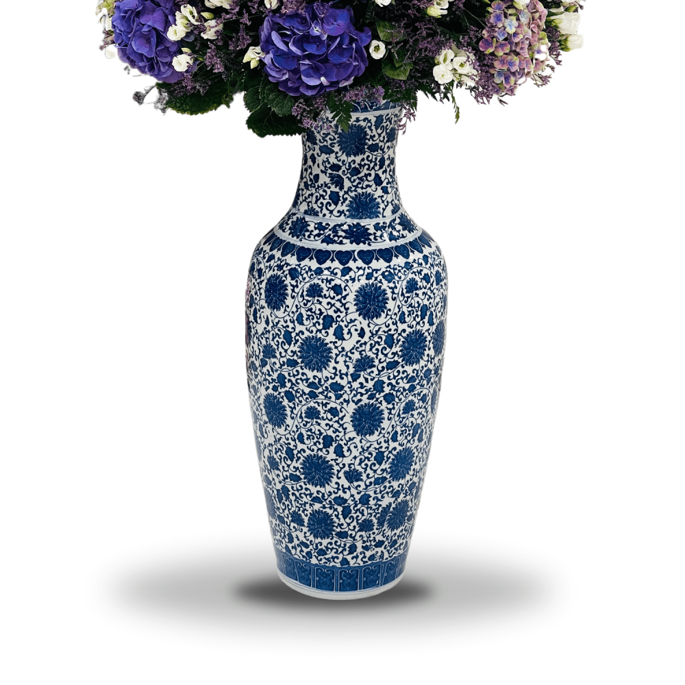 Style, charm, and flair—this elegant design has it all. Our contemporary floral arrangement features hydrangeas, Eustoma, and seasonal fillers, all artfully intertwined with foliage, creating an arrangement that truly stands out. Presented in an 80 cm blue-colored vase, this design exudes sophistication and modern elegance, making it the perfect gift for any special occasion.